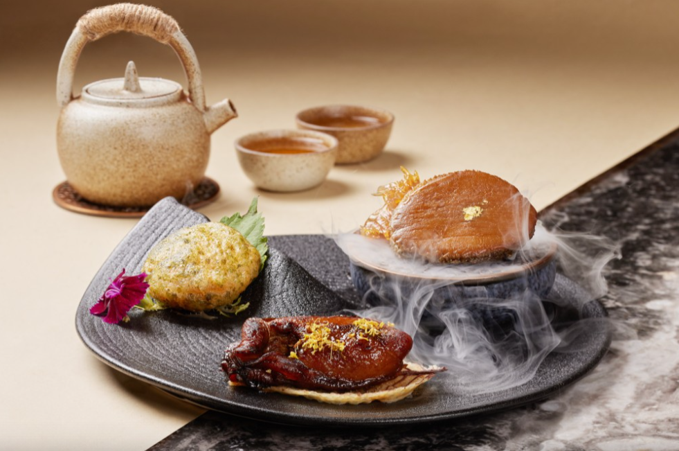 前菜三重奏包括花雕醉鮑魚、海苔蟹粉脆藕餅和桂花蜜汁香煎金蠔,三重海鮮風味。