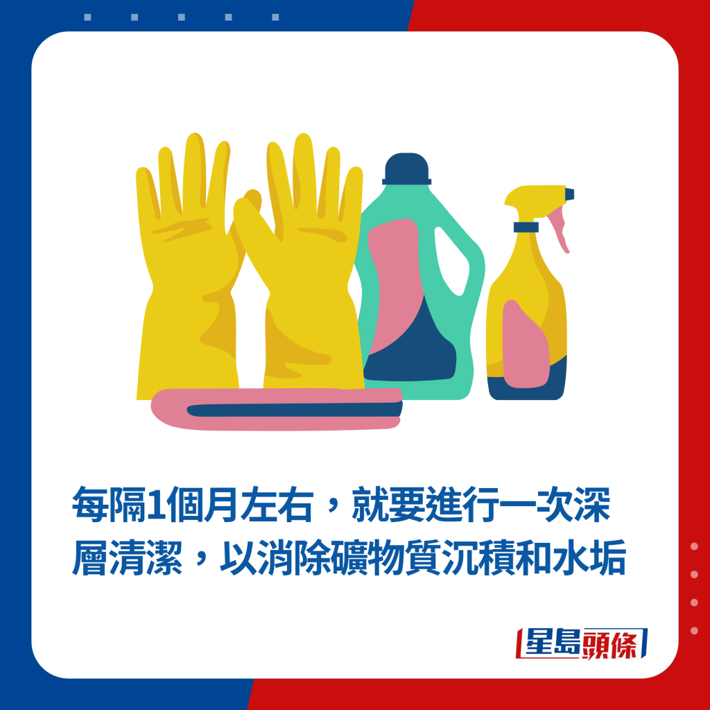 每隔1個月左右,就要進行一次深層清潔,以消除礦物質沉積和水垢