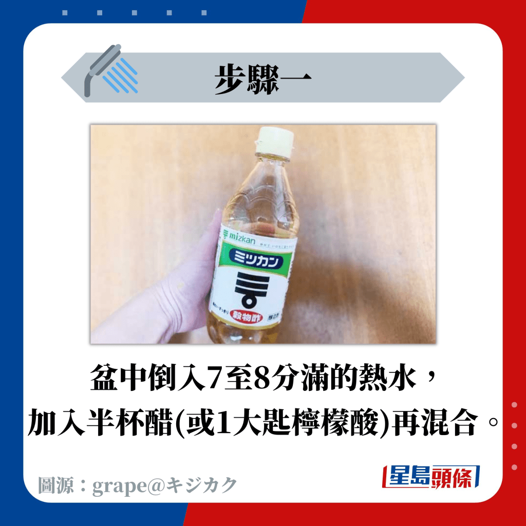 盆中倒入7至8分滿的熱水, 加入半杯醋(或1大匙檸檬酸)再混合。