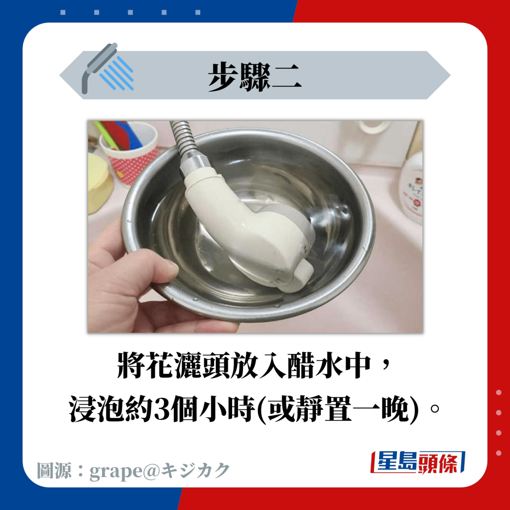 將花灑頭放入醋水中, 浸泡約3個小時(或靜置一晚)。