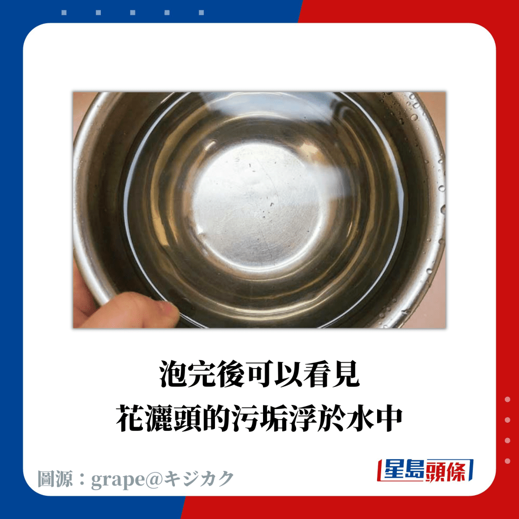 ▲泡完后可以看見花灑頭的污垢浮于水中