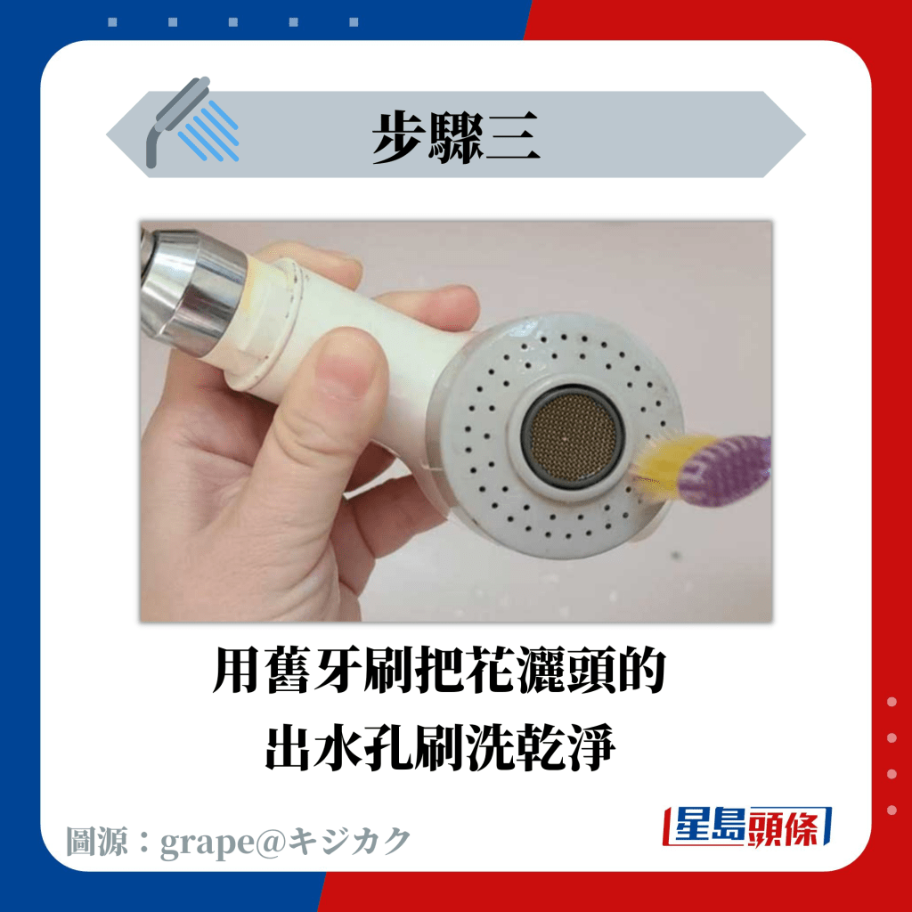 ▲用舊牙刷把花灑頭的 出水孔刷洗干凈