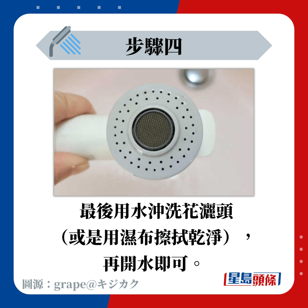 最后用水沖洗花灑頭 (或是用濕布擦拭干凈), 再開水即可。