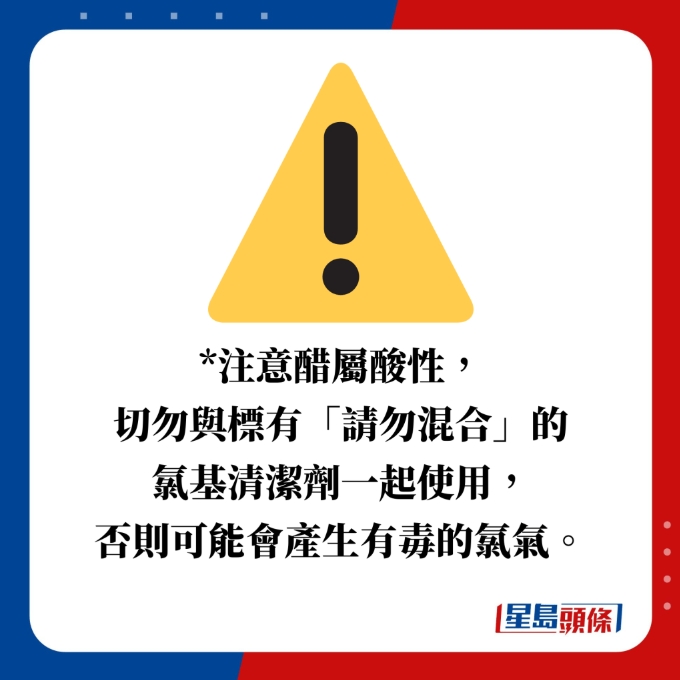 注意醋屬酸性,切勿與標有“請勿混合”的 氯基清潔劑一起使用,否則可能會產生有毒的氯氣。