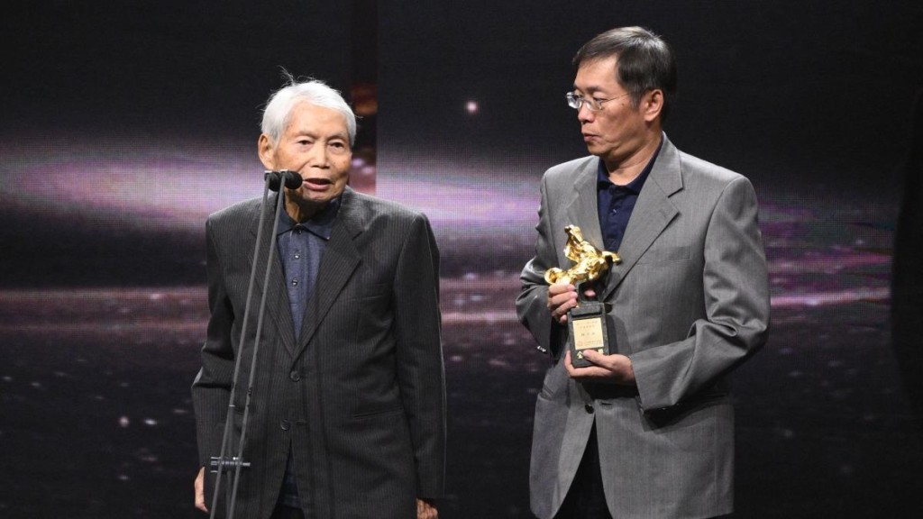 攝影師林文錦(右)獲金馬獎頒終身成就獎,由兒子攙扶上臺領獎。