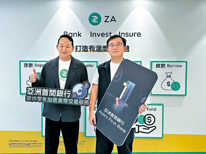 ▲ZA Bank替任行政總裁吳忠豪(左)與HashKey首席分析師丁肇飛,講解新推出的買賣加密貨幣服務。