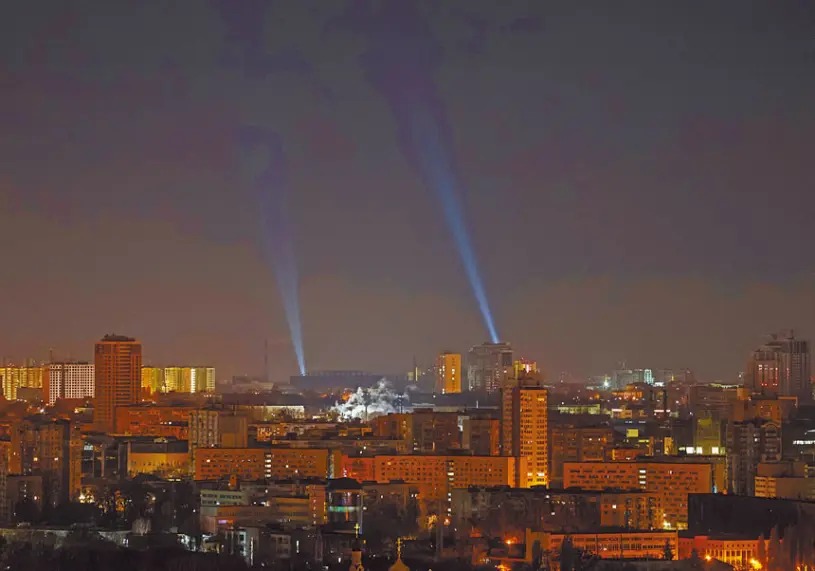 烏軍上周三使用探射燈在城市上空搜尋無人機。