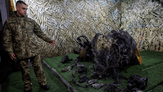 ▲上周四襲擊烏克蘭第聶伯羅市的俄新高超音速導彈“榛樹”的碎片,在烏國一間鑒證中心展示。(路透社)