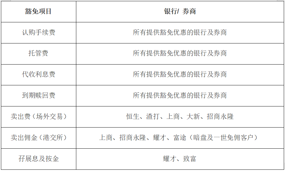 銀行及券商一如以往推多項優惠吸資金,豁免多項費用,主要包括認購費、代收息費、到期贖回費等,部分銀行連公開市場買賣債券亦不收傭金,以下為主要收費的豁免情況: