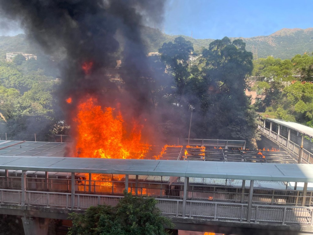 香港荃灣象鼻山路山坡起火,隔音屏障變烈火隧道