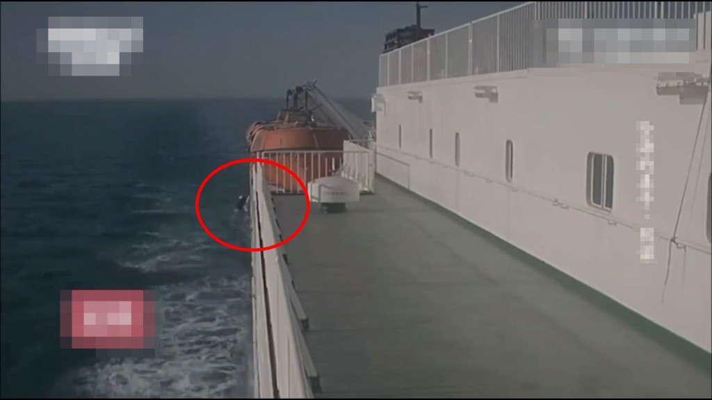 10分鐘后,他把妻子騙到欄桿外面,停放救生船的地方。該位置正是閉路電視未能拍攝的盲點,而船外另一閉路電視卻拍下,李某環墮海的情況。