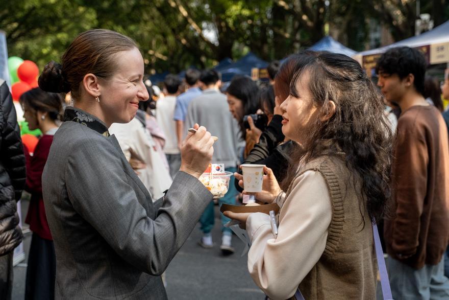 The food court was one of the festival's highlights, where international students set up booths showcasing their culinary traditions. The air was filled with the irresistible aromas of Turkish lahmacun, French canelés paired with wine, Venezuelan arepas, and Malaysian nasi lemak. These delectable dishes delighted both students and faculty who gathered to savor the international flavors. The Tajikistan booth, offering traditional oshi palav and the signature dish qurutob, attracted a lot of attention.The American booth, featuring hamburgers and chocolate chip cookies, was also a big hit. Wu, a student from the Business English Department, shared her excitement: "The American students were incredibly friendly, and the food was fantastic!"