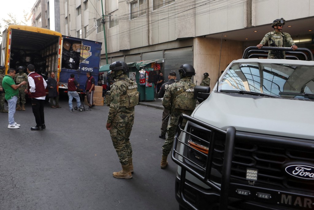 墨西哥海軍人員監督檢獲貨物。(路透社)