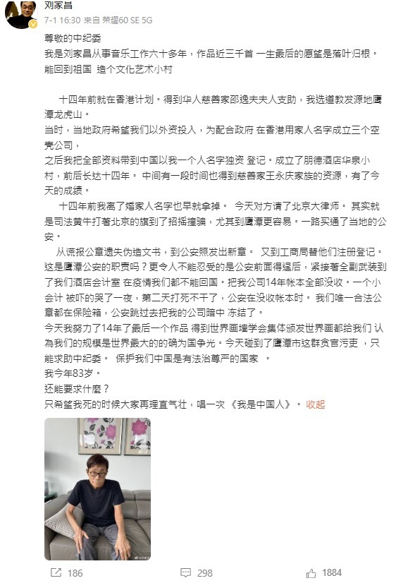 臺灣樂壇代表人物劉家昌,3日傳出因癌癥離世消息,享年81歲。對此臺灣經理人暫時未有回覆,不過有指他香港友人已證實他病逝,并稱劉家昌腦跟肺部有腫瘤。劉家昌在社交平臺最新一則發文,于今年7月發長文怒控前妻偽造文書,亦在文中提及自己的遺愿。從照片可見,他神情憔悴兼兩眼無神,而且身材相當瘦削,與過往的狀態相差甚遠。