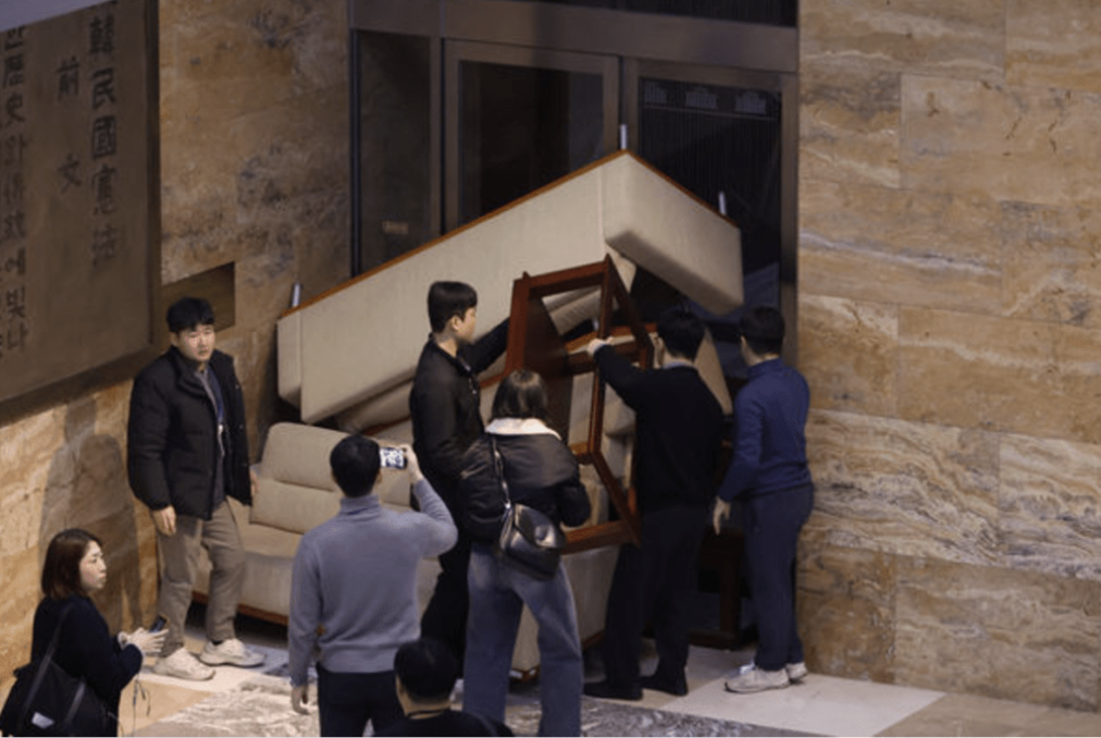 ▲國會議員以椅子擋住國會門戶,阻戒嚴軍進入。 路透社