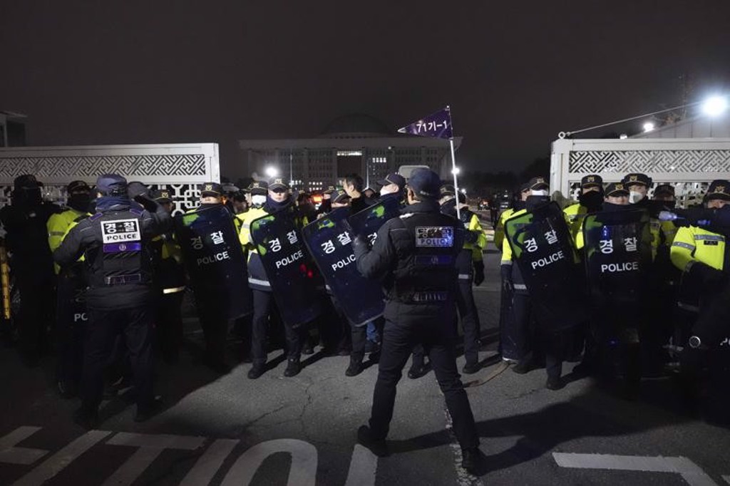 韓國總統尹錫悅3日宣布戒嚴,韓國警方在首爾國會前戒備。