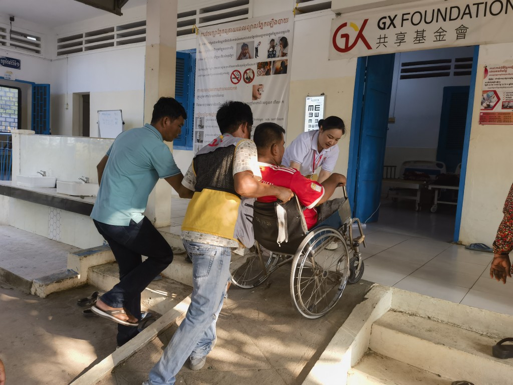 ▲在波羅勉項目點,有些病人因失明而行動不便,需要輪椅代步,醫療隊成員與當地志愿者合力將他送到不同檢查的地點,然后接受手術。