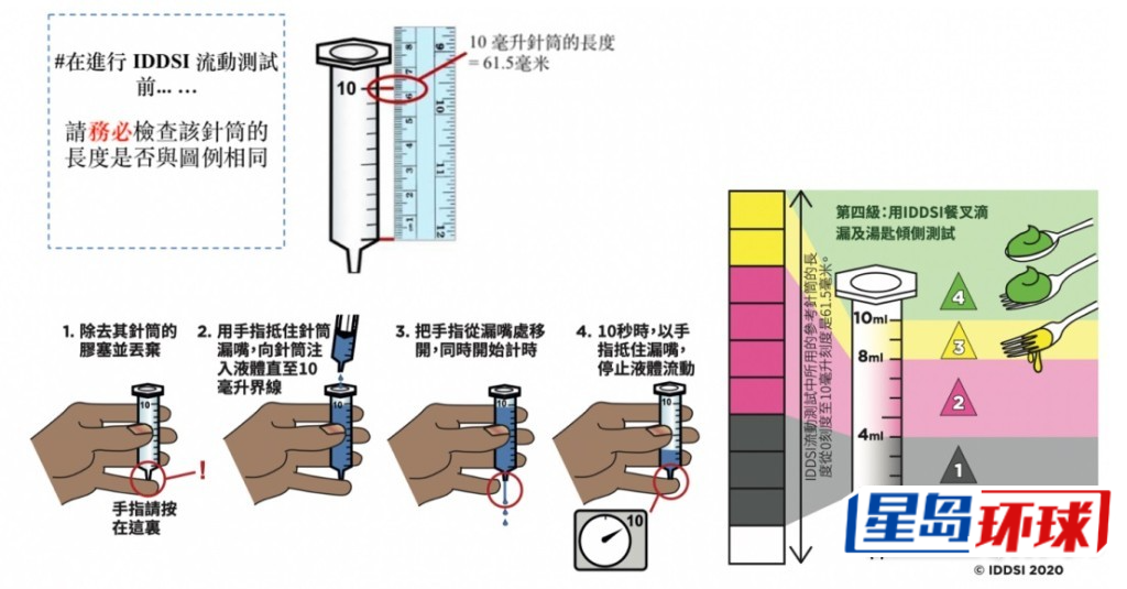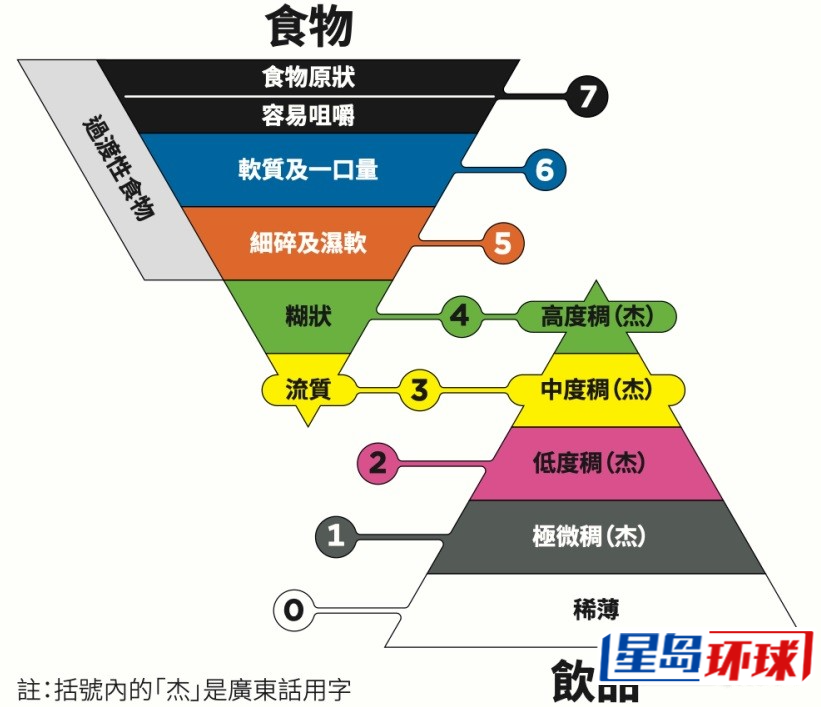 ▲國際吞咽障礙飲食標準化創辦組織(IDDSI)訂立一套適用于吞咽障礙患者的8級制飲食框架,各個級別皆有簡易測試方法。
