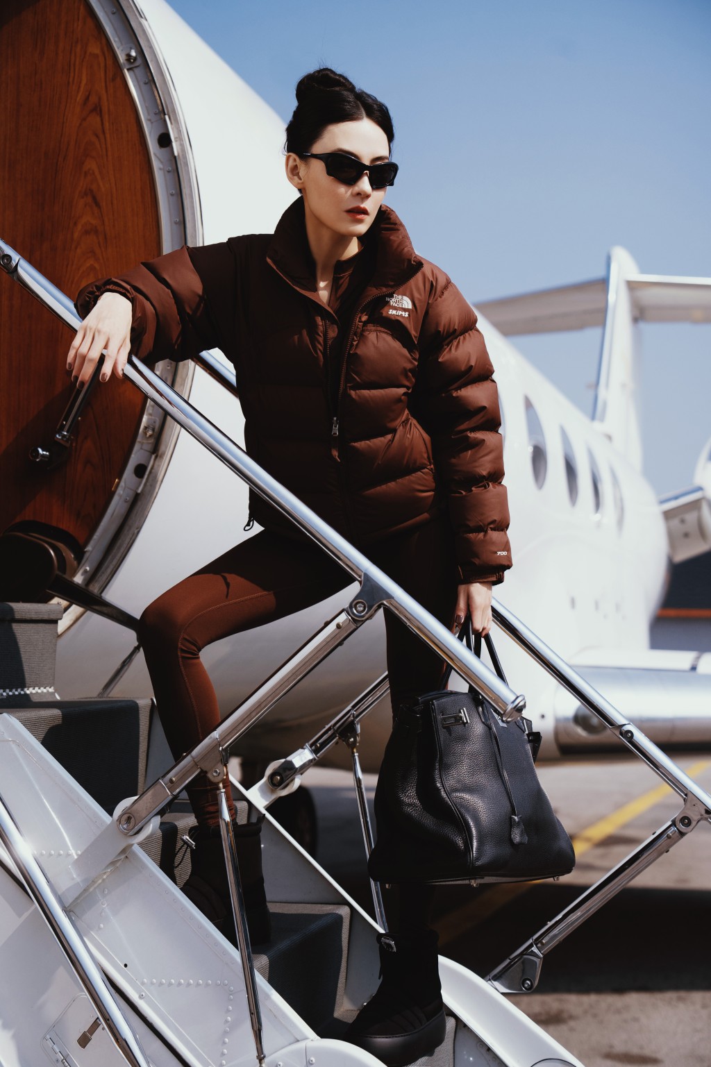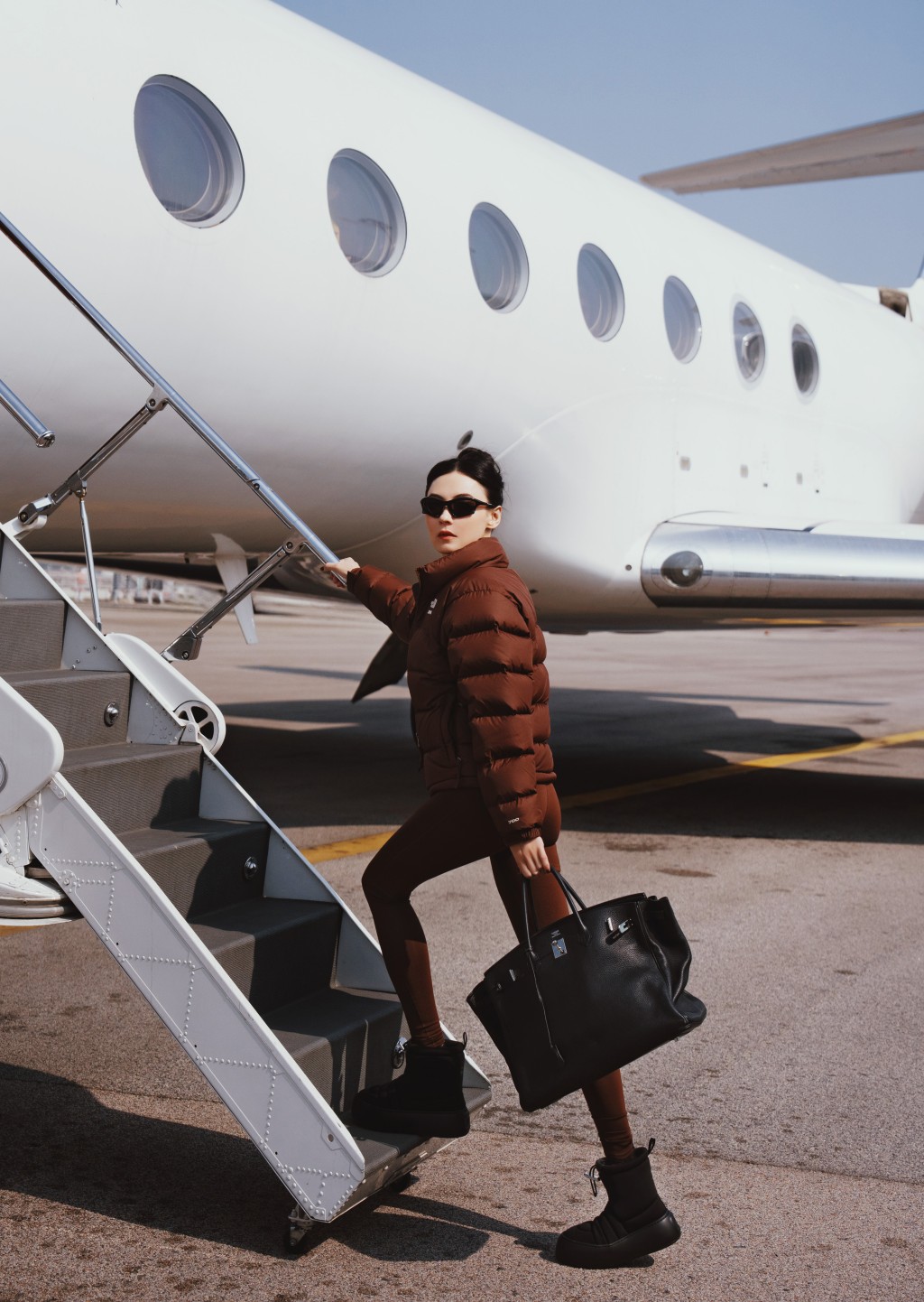 扎起丸子頭的張栢芝身穿一件棕色羽絨服及同色貼身連體衣,再配上黑色短靴及墨鏡,完美地襯托出她的纖幼身形,整體造型既保暖又充滿時尚氣息。