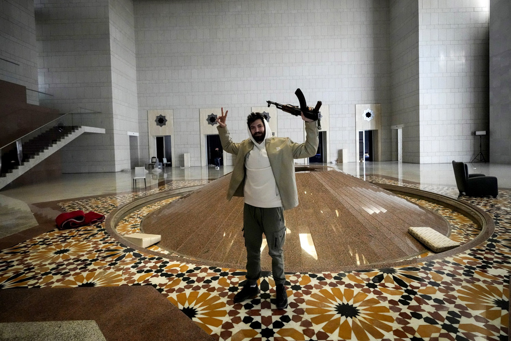 ▲敘利亞總統巴沙爾·阿薩德(Bashar al-Assad)搭機逃亡后,敘利亞叛軍及民眾闖進總統府洗劫,還發現阿塞德有一整排奔馳、法拉利、保時捷等豪車收藏。圖為8日一名男子手持AK-47在總統府拍照。(美聯社)