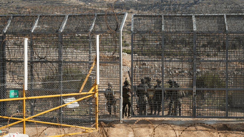 以色列士兵站在?;鹁€外,敘利亞一側。路透社