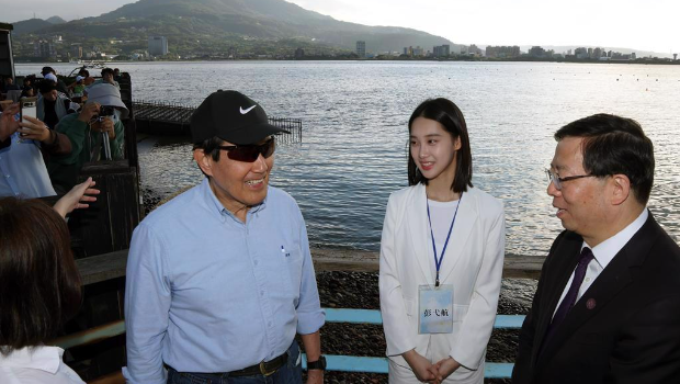 ▲陸生團3日參訪滬尾炮臺、淡水河岸步道、紅毛城等地。馬英九(左)、陸生彭弋航(中)、清華大學黨委書記邱勇(右)等人在淡水河邊閑聊。中時