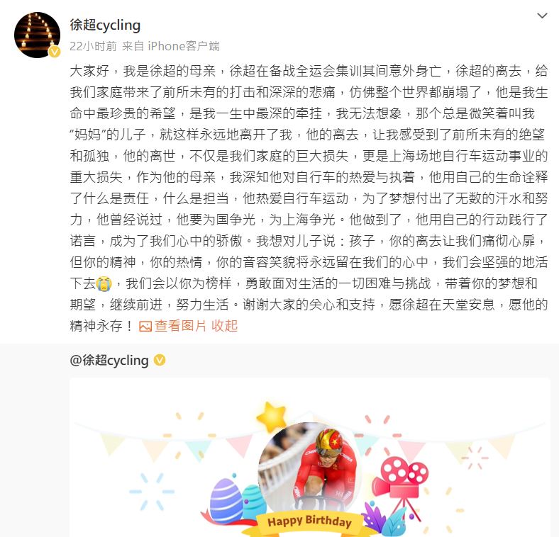 徐超的母親于昨日(10日),在微博發市宣布噩耗,訃聞中指,徐超集訓備戰全運會時,意外身亡?!靶斐碾x去,給我們家庭帶來了前所未有的打擊和深深的悲痛,彷彿整個世界都崩塌了”,11月5日,徐超剛滿30歲。