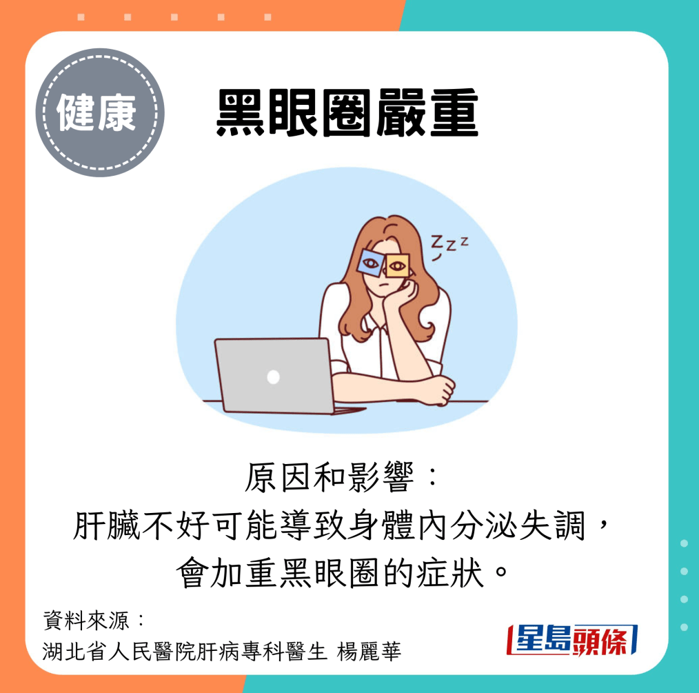 若睡眠充足,仍然有嚴重的黑眼圈,有可能是肝臟出現問題。