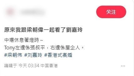 網民遇見梁朝偉開心留言:“原來我跟梁朝偉一起看了劉嘉玲,中場休息著燈時~Tony左邊系張叔平,右邊系屋企人?!辈簧倬W民羨慕見到梁朝偉外,更贊梁朝偉與太太劉嘉玲好恩愛:“看著像梁媽媽和妹妹”、“哈哈哈哈他一定會支持老婆的嘛嗑”、“像個乖孩子”。劉嘉玲也有分享夫妻合照,并在IG簡單留言:“1/58《香港式離婚》”,不過因舞臺劇名嚇親網民:“嚇死,以為你兩個離了!”