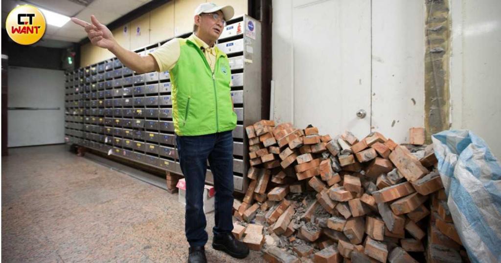 他也提到,這棟大樓也40年了,到處都有水泥石塊掉落、鋼筋外露,也怕地震有危險,希望市府重視這個問題,能協助輔導公辦都更、將容積率放大,“里面套房只有10坪,不能1坪換1坪,沒都更意愿,只好一直擺下去,等哪天又發生什么再說了?!彼J為,只要容積率能到840%,就有希望。