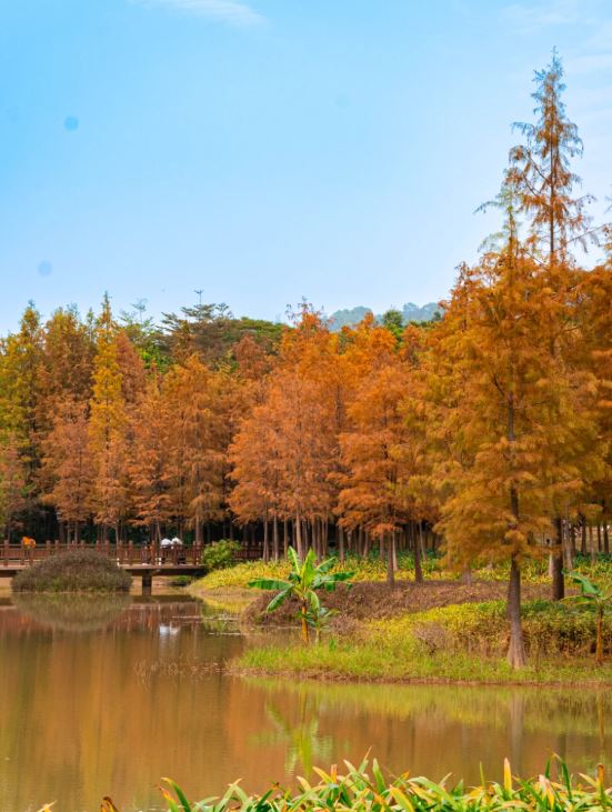 深圳紅花嶺公園向來都是深圳龍崗區,最大規模的落羽杉觀賞地點。落羽杉乃南方紅葉的獨特自然美景,最佳欣賞期由12月至1月,隨著氣溫進一步下降,由原本的綠葉開始出現變為黃色,之后變為紅色,營造唯美的冬日景致,詩意十足。