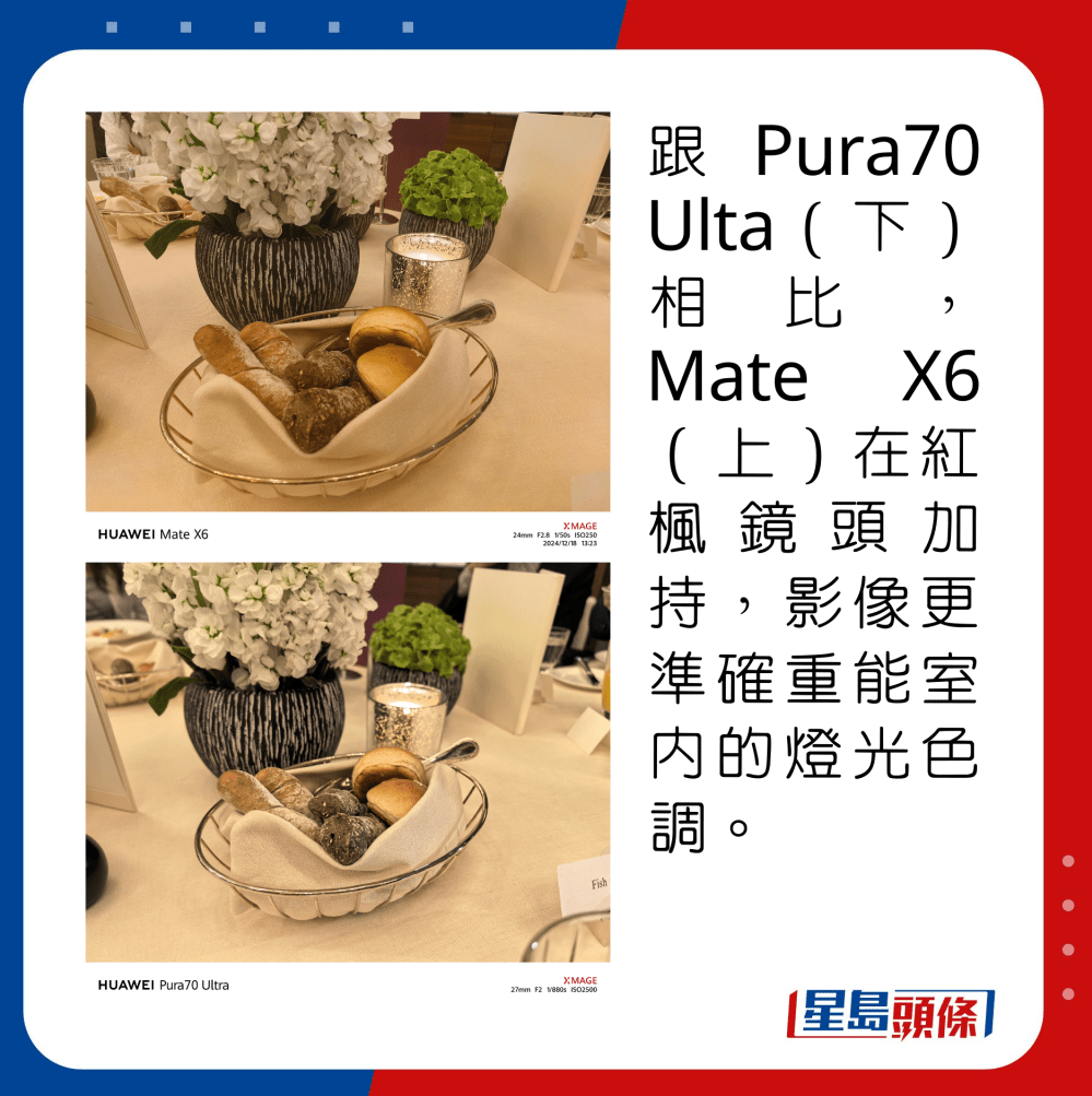跟Pura70 Ulta(下)相比,Mate X6(上)在紅楓鏡頭加持,影像更準確重能室內的燈光色調。