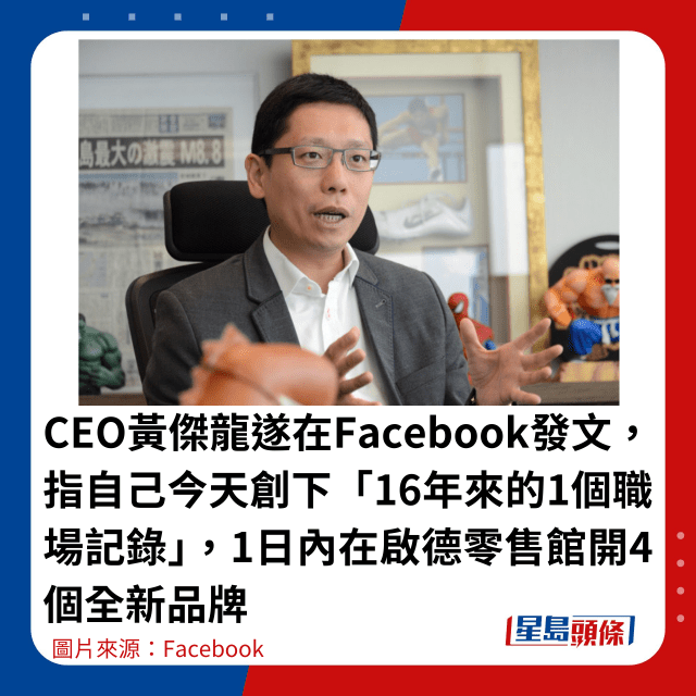 CEO黃杰龍遂在Facebook發文,指自己創下“16年來的1個職場記錄”,即1日內在啟德零售館開4個全新品牌,當中包括牛角新副線品牌“牛角J”、株式會社旗下火鍋新品牌“好鍋日子”、米芝蓮必比登推介餐廳“兩姊妹涼皮”、及中西fusion的創意食肆“KAMO”。