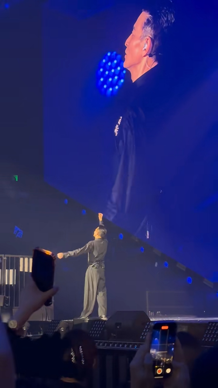 ▲劉德華身穿黑色襯衫及同色西裝馬甲背心,正在臺上感情充沛地演唱金曲《17歲》,不時走向臺邊與臺下歌迷揮手互動。