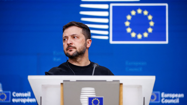 ▲烏克蘭總統澤連斯基19日在比利時布魯塞爾出席歐洲理事會會議記者會。(路透)