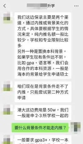 當被問及如何保證獲得錄取時,中介解釋是通過“內推”渠道,即通過中介機構可獲得大學教授的內部推薦信。雖然名額有限,且要求具備一定學業水平,但入學門檻遠低于常規申請。中介強調:“只要雅思英語測試(IELTS)能夠考獲5.5分,無需考慮內地高考成績也能夠通過‘內推’入讀港三大(港大、中大、科大)?!?/p>