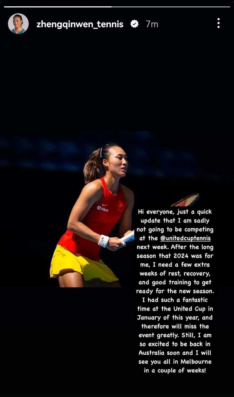 ▲鄭欽文在公告中稱,“經歷了漫長的2024賽季之后,我需要多幾周的時間來休息和恢復,好好訓練為新賽季做準備?!彼瑫r表示,今年1月在聯合杯度過了美好的時光,因此會非常想念這項賽事。 圖片來源:WTA社交媒體