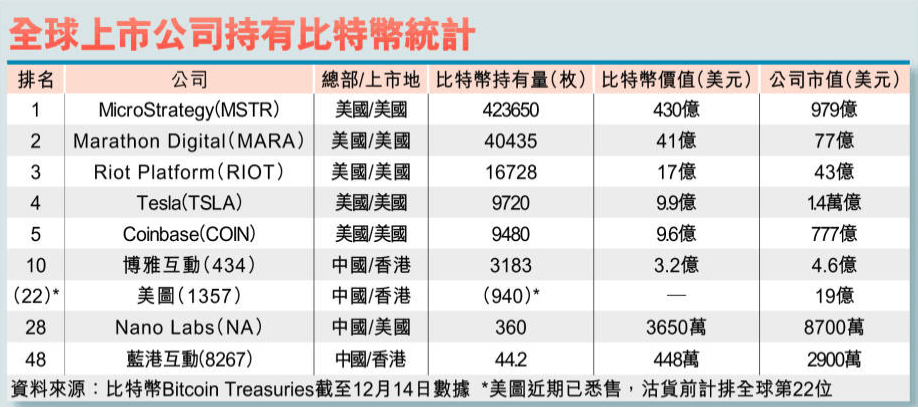 從事Web3游戲開發的博雅互動,最新披露已持有3,183枚比特幣,價值逾3.2億美元,數量在全球上市公司排行第10,比特幣牛市亦造就其股價11月飆升近1.7倍。博雅互動主席戴志康向《星島》表示,對比特幣有極大信心,深信加密貨幣將成為未來主流資產,但“現在離這一目標還非常遠”,未有任何出售計劃,長遠亦會透過業務利潤不斷增持。他又稱,得益于MSTR囤幣的成功經驗,“不排除采取像MSTR一樣的融資策略持續增持比特幣”,冀至少保持亞洲領先地位。