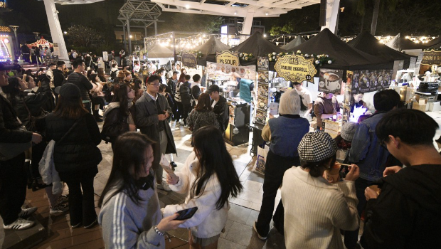 備受歡迎的赤柱圣誕市集,越夜越繽紛,售賣首飾、寵物零食、水晶燈飾、啤酒等店鋪前人流不斷。有韓國游客花費數百元購買手作耳環,將“made in Hong Kong ”帶回家。