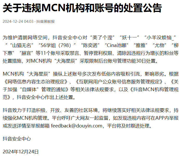 公告稱,MCN機構“大海星辰”操縱上述賬號多次發布低俗內容吸粉引流,影響惡劣。根據《網絡信息內容生態治理規定》、《互聯網用戶公眾賬號信息服務管理規定》、《關于加強“自媒體”管理的通知》等相關法律法規要求,以及《抖音MCN機構管理規范》,抖音安全中心作出上述處置。
