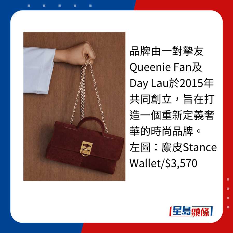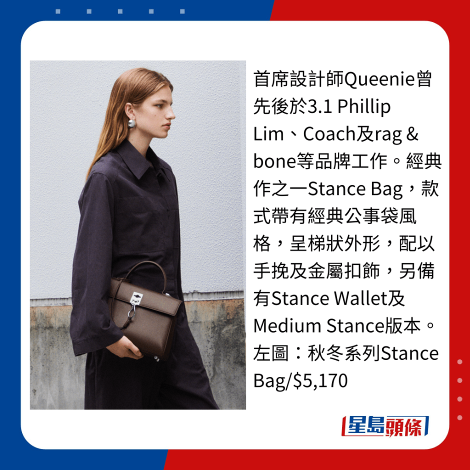 首席設計師Queenie曾先后于3.1 Phillip Lim、Coach及rag & bone等品牌工作。 經典作之一Stance Bag,款式帶有經典公事袋風格,呈梯狀外形,配以手挽及金屬扣飾,另備有Stance Wallet及Medium Stance版本。