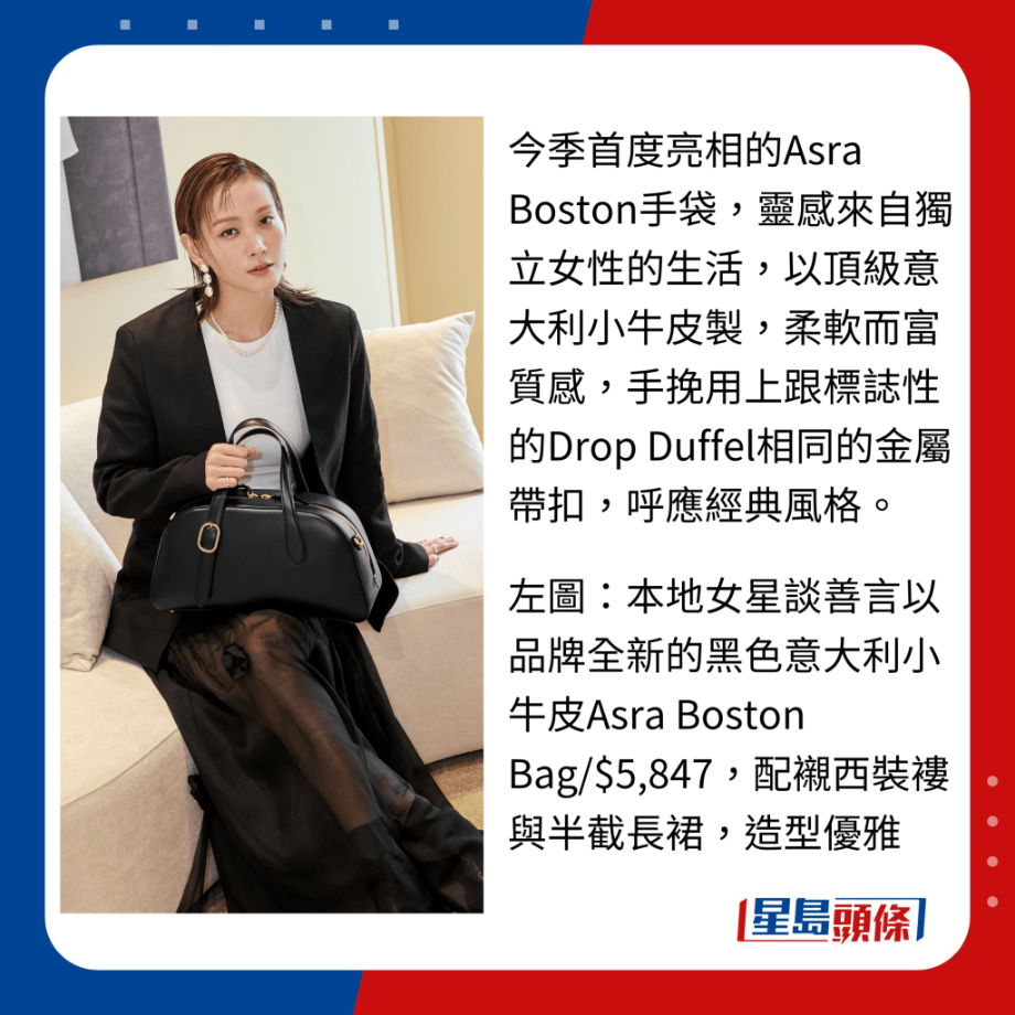 今季首度亮相的Asra Boston手袋,靈感來自獨立女性的生活,以頂級意大利小牛皮制,柔軟而富質感,手挽用上跟標志性的Drop Duffel相同的金屬帶扣,呼應經典風格。