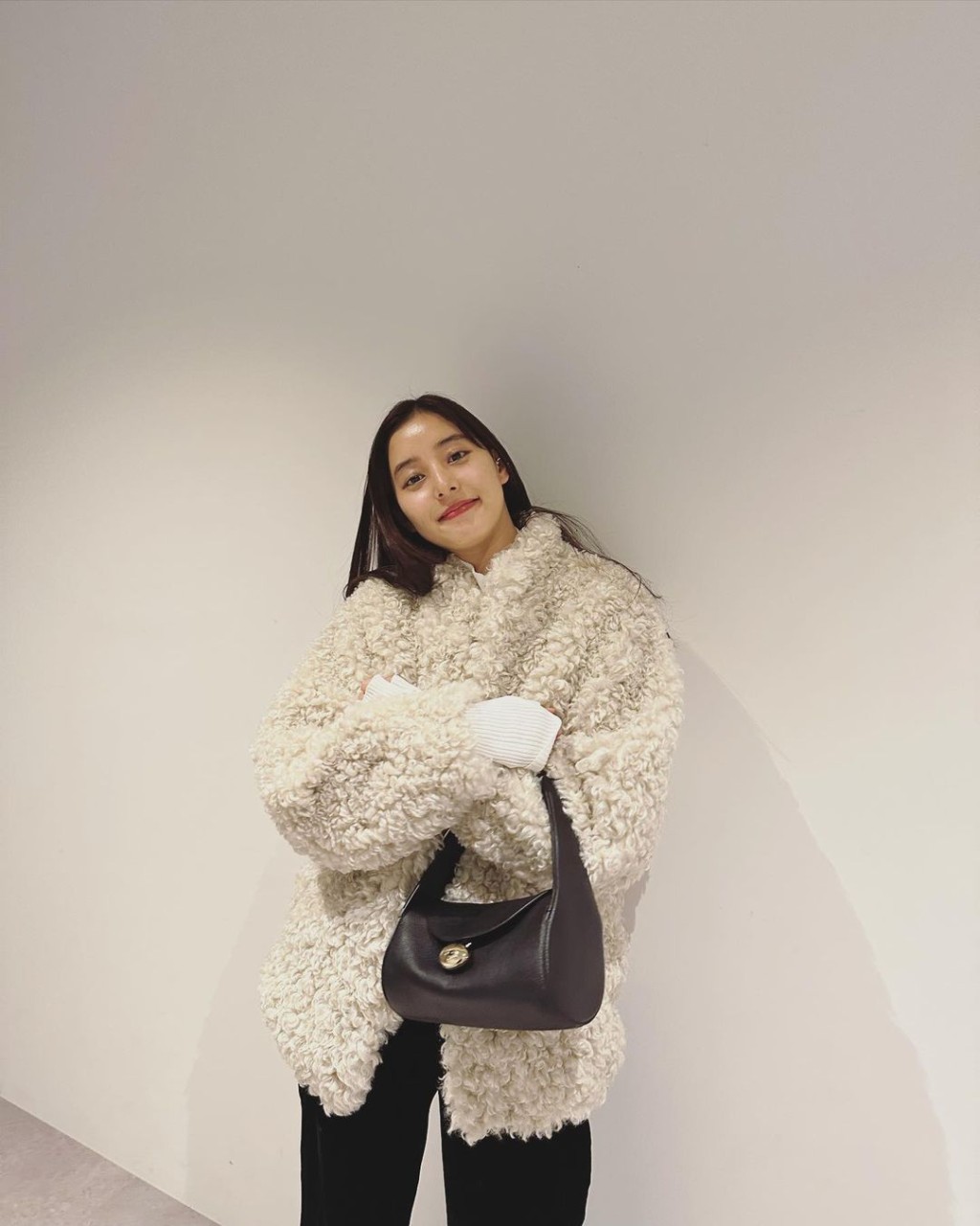 日本女星新木優子以毛毛大衣及長褲的冬日造型,配搭品牌的手袋,倍添優雅,亦豐富造型。