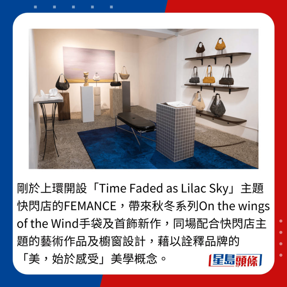 剛于上環開設“Time Faded as Lilac Sky”主題快閃店的FEMANCE,帶來秋冬系列On the wings of the Wind手袋及首飾新作,同場配合快閃店主題的藝術作品及櫥窗設計,藉以詮釋品牌的“美,始于感受”美學概念。