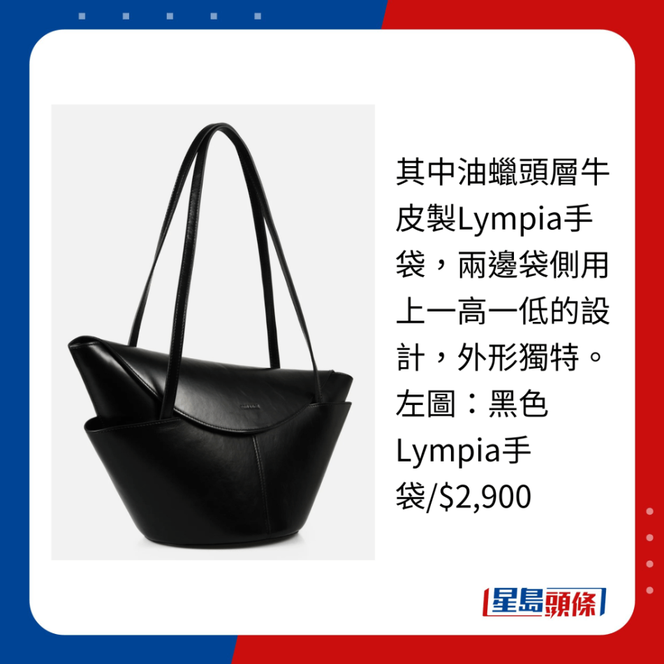 其中油蠟頭層牛皮制Lympia手袋,兩邊袋側用上一高一低的設計,外形獨特。