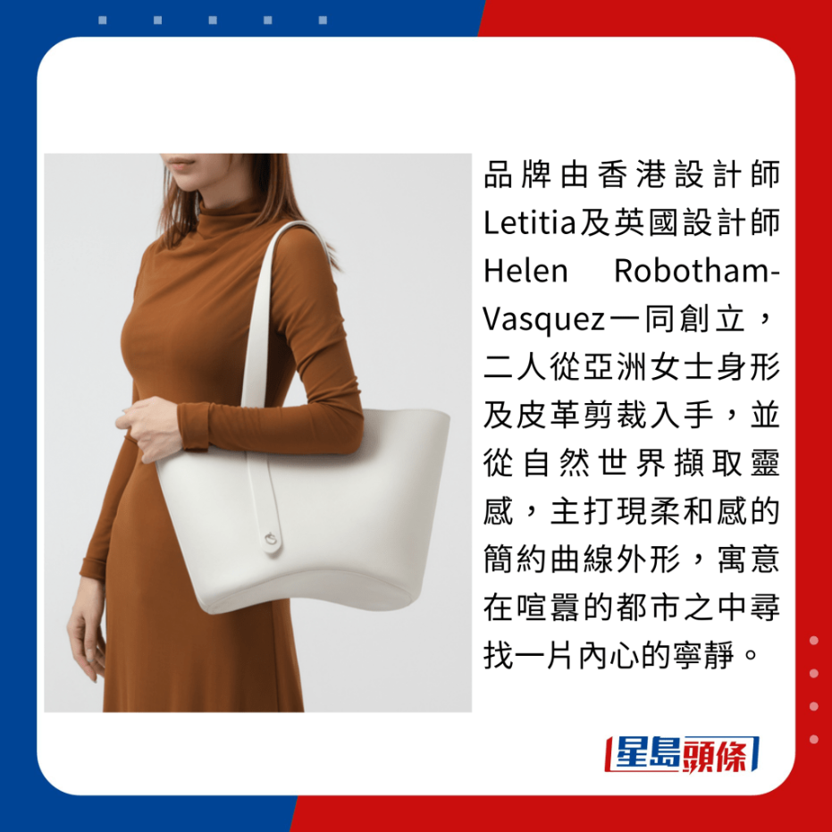 品牌由香港設計師Letitia及英國設計師Helen Robotham-Vasquez一同創立,二人從亞洲女士身形及皮革剪裁入手,并從自然世界擷取靈感,主打現柔和感的簡約曲線外形,寓意在喧囂的都市之中尋找一片內心的寧靜。