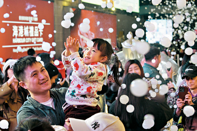 除了西九文化區外,尖沙咀昨晚也是人山人海,尤其是海運大廈戶外圣誕裝置發放煙火及增添“飄雪泡泡”效果,吸引不少市民和旅客駐足,并舉起手機拍照留念。