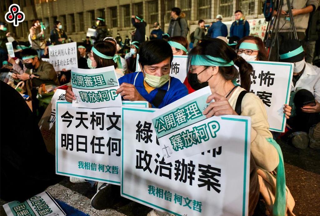 ▲臺北地檢署偵辦京華城案、柯文哲政治獻金案26日偵結,不少小草(民眾黨支持者)晚間前來北檢聲援柯,手舉公開審理、釋放柯P、政治辦案羅織罪名、司法要公正程序要正義等標語。