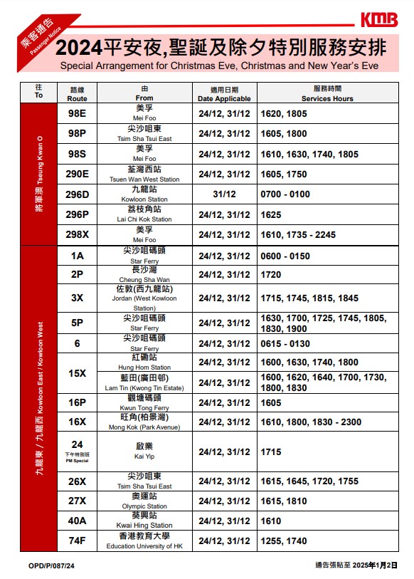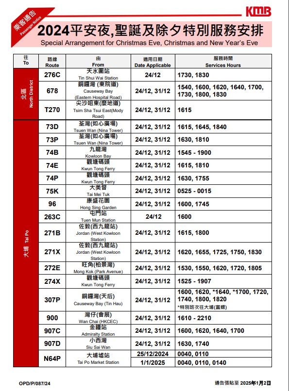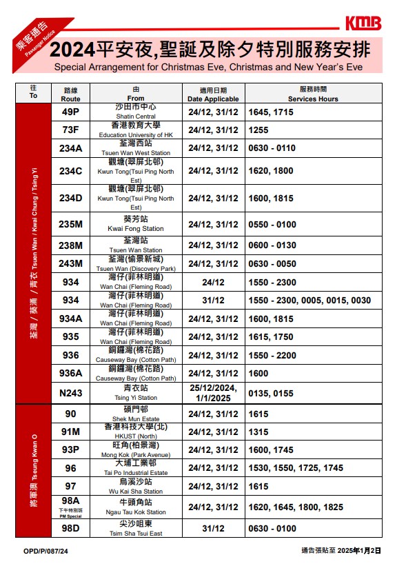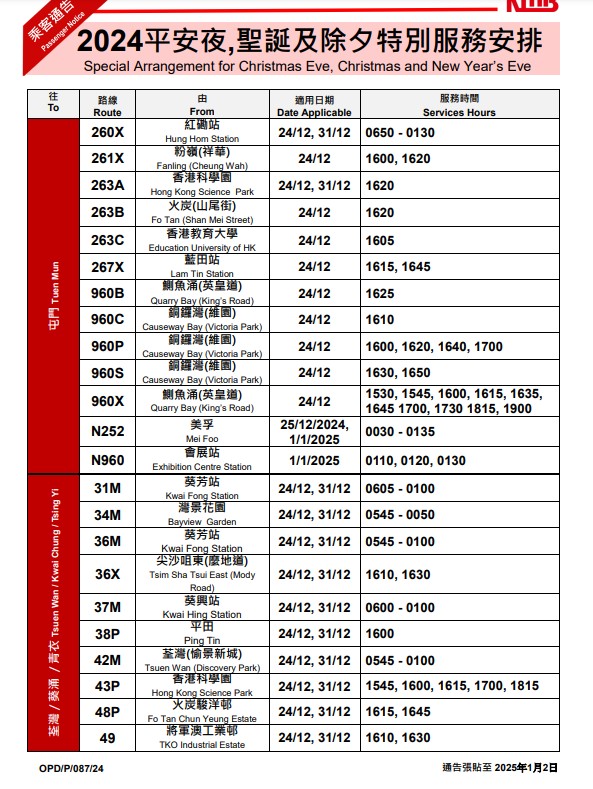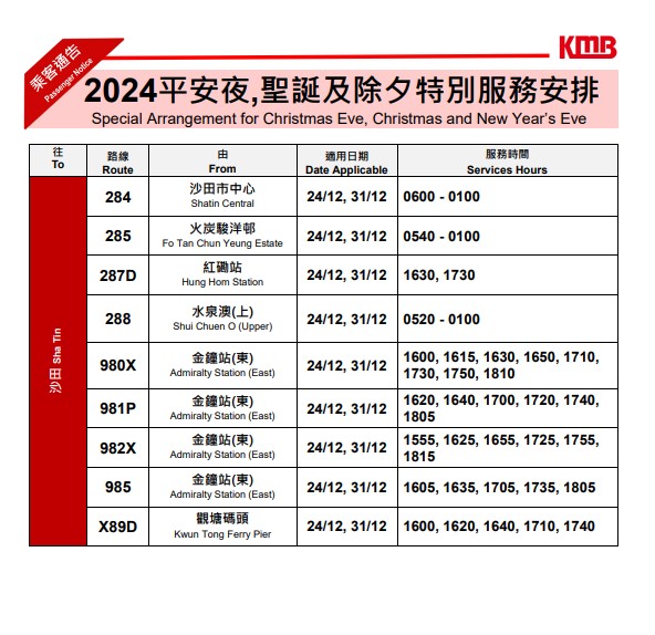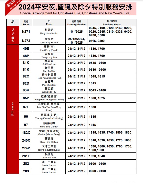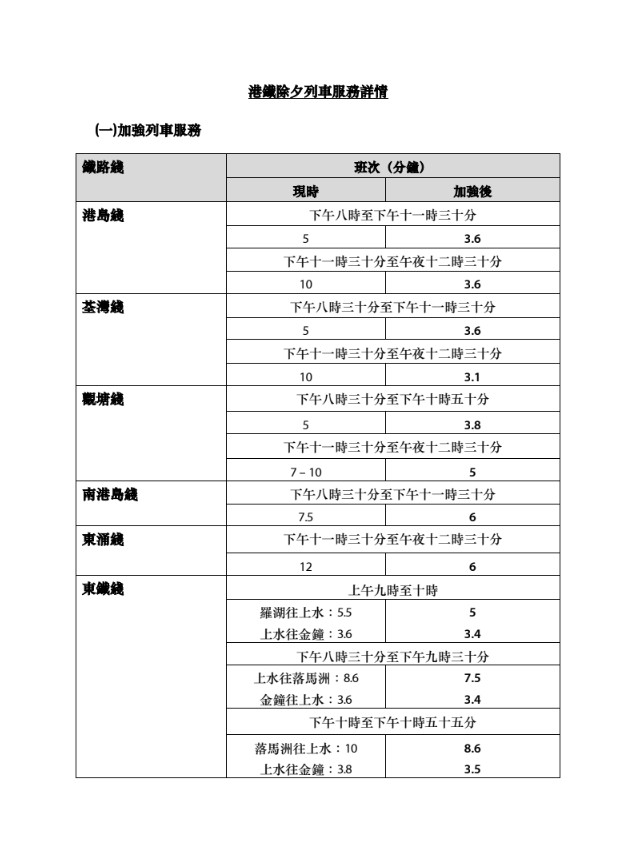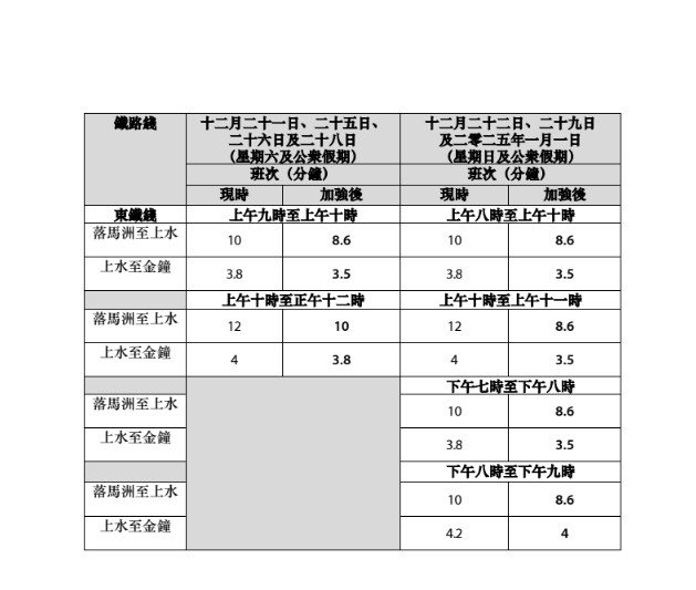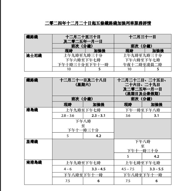 另外,港鐵在12月20日起至2025年1月1日會在不同時段加強列車服務,港島線及南港島線會在周末及假日大部份時間加密班次,至約3-4分鐘一班車;12月31日除夕下午3點開始行駛晚上繁忙時段班次,3-5分鐘一班車。