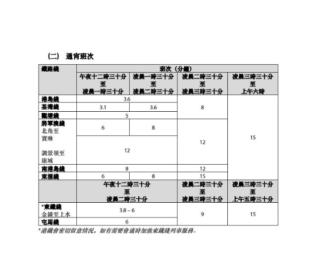 由羅湖站開往金鐘站的尾班車為凌晨2時30分,即口岸關閉后約半小時開出。但東鐵線往返落馬洲站不會延長服務。